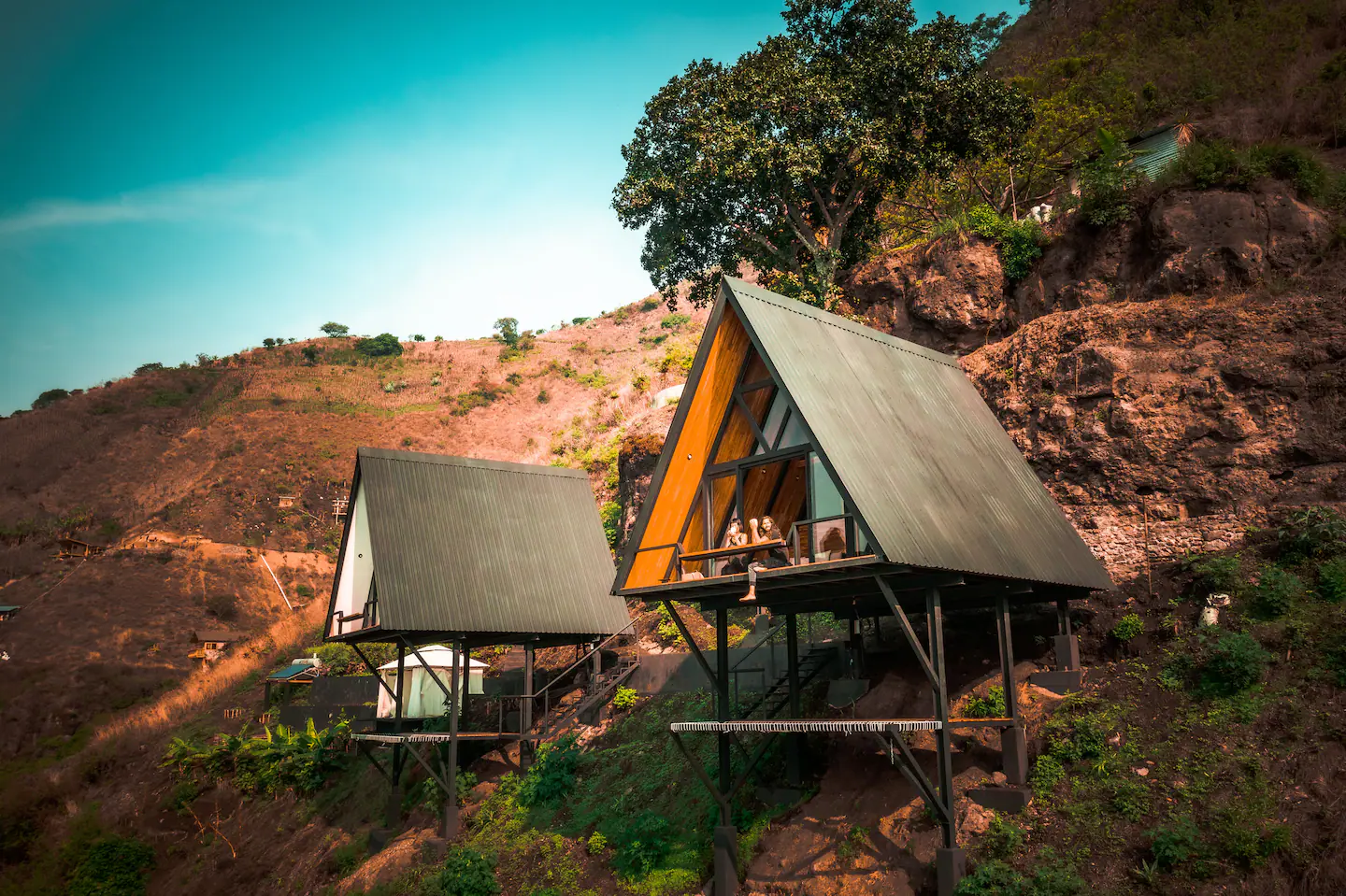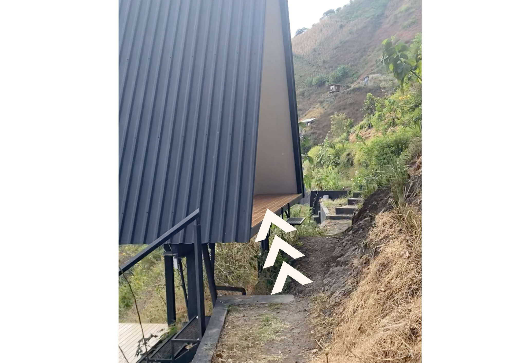 The final stretch is a short uphill nature walk with stairs. This elevated access is part of what creates our peaceful cliffside setting and expansive lake and volcano views.